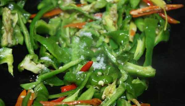 接著熱鍋下油放入蒜片和薑絲爆出香味,倒入切好的辣椒,大火翻炒加點鹽更能突出辣椒的辣味喲。