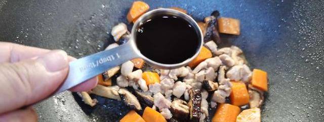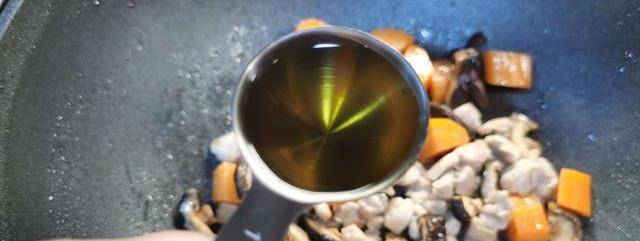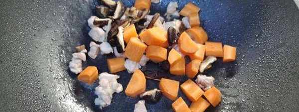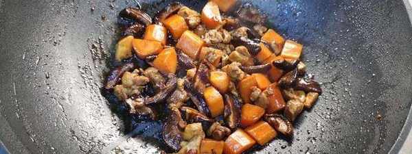 2、鍋中倒油,放入雞肉翻炒至變色,下入香菇、胡蘿卜翻炒一下。