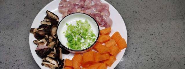 1、8朵幹香菇用開水泡發,然後清洗幹凈,瀝幹水分,切成小塊;胡蘿卜去皮切小塊;雞肉剔除骨頭,切小塊;小蔥清洗幹凈切碎。