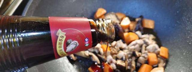3、放入1勺料酒、2勺生抽、1勺蠔油、半勺老抽,翻炒均勻。