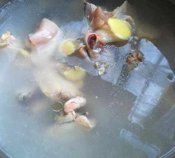 第4步、即雞塊入水焯水,傢料酒和薑片去腥,焯水後撈出瀝幹水分。