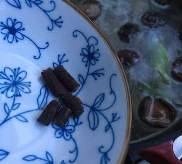 第10步、紅參切小段放入鍋中。