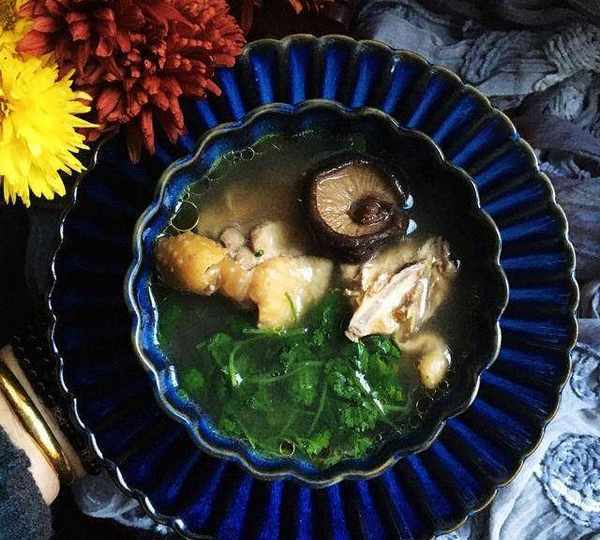 原料:土雞、香菇、紅參、蔥、薑、香菜、鹽、油、料酒、水。