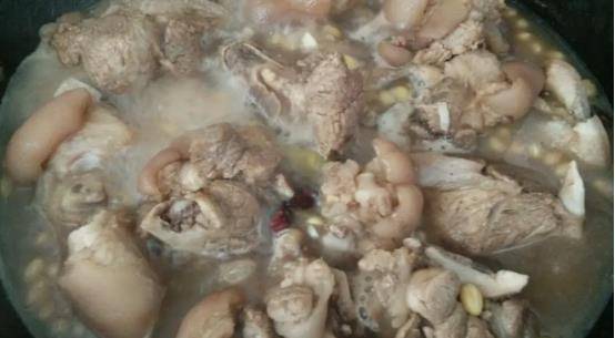 步驟3:豬蹄煮到軟爛的時候,加入配菜(根據自己喜好,加入喜歡的菜,比如藕、海帶等,如果是黃豆這種耐煮的食材,就要早點下鍋,不然煮不爛)。
