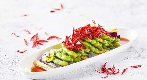 毛豆100克、雙色腐竹100克、糊辣油25克、蒜末8克、鮮辣毛豆汁