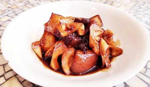 加入冰糖和筍繼續燜燒至9成熟,開蓋轉中火收汁至湯稠汁亮,出鍋前淋入米醋提鮮