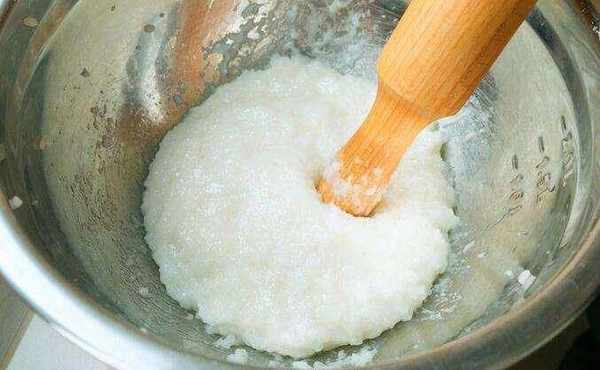 3:把糯米倒入大碗中,用打蛋器打5分鐘,也可以用搟面杖搟成粘稠的狀態,8分鐘就可以