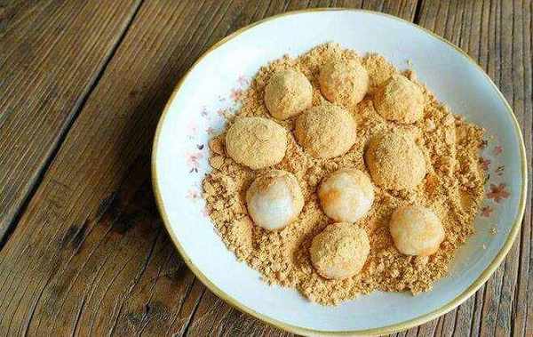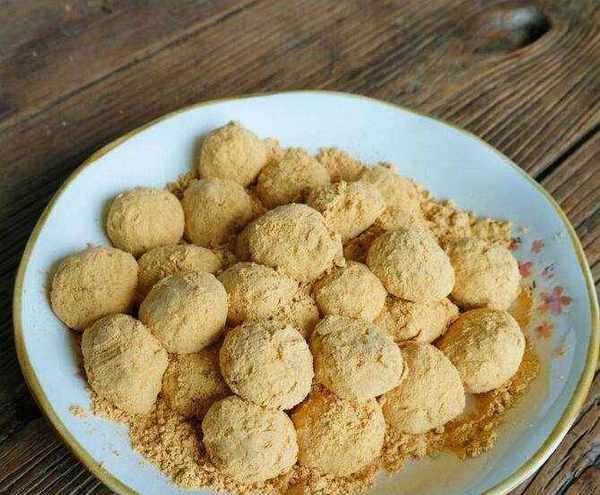 5:用手搓成長條,放入黃豆粉碗中滾一圈