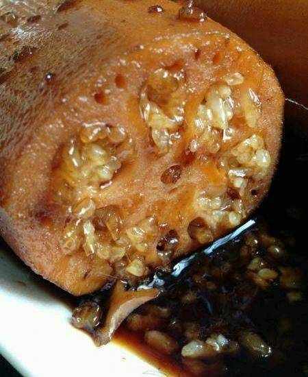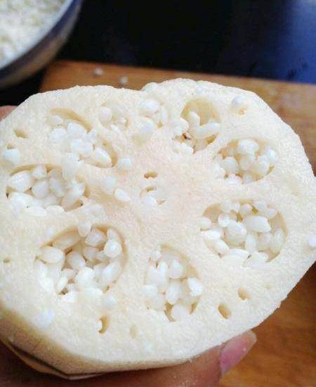 最需要耐心的就是往藕裡面裝糯米瞭,但是我有個好辦法,三分鐘綽綽有餘,抓一把糯米,別抓太多瞭哦