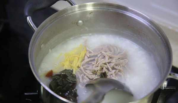 5、將事先備好的無鉛皮蛋剝殼,剁成小塊兒,煮好的裡脊肉切成細絲,生薑去皮搓絲,在開火前五分鐘左右事先將以上材料放入鍋中;在攪拌的狀態下煮五分鐘,最後加入備好的一勺雞粉、適量鹽、一小撮白胡椒粉,攪拌均勻;