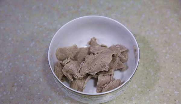 3、起鍋燒水,鍋中加入1200克冷水,緩慢放入醃制入味的裡脊肉片,煮至水沸騰起沫,裡脊毫無血色;用勺子小心撇去鍋中浮沫,撈出煮好的肉片,肉湯放置一旁備用;