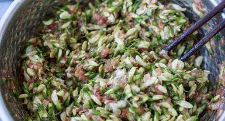 3.槐花、肉餡攪拌,打入一個雞蛋,攪拌。