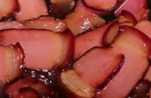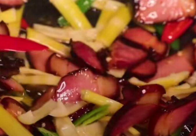 第三步、鍋燒熱,再倒入臘肉炒出幼稚,炒至臘肉外皮微黃,然後倒入青紅椒和竹筍翻炒均勻,炒至青紅椒斷生。