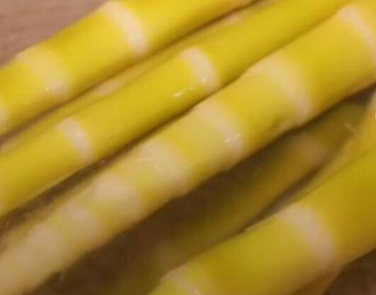 第二步、將竹筍從中間分成兩半,然後再切成長段備用,把臘肉切成厚片備用。