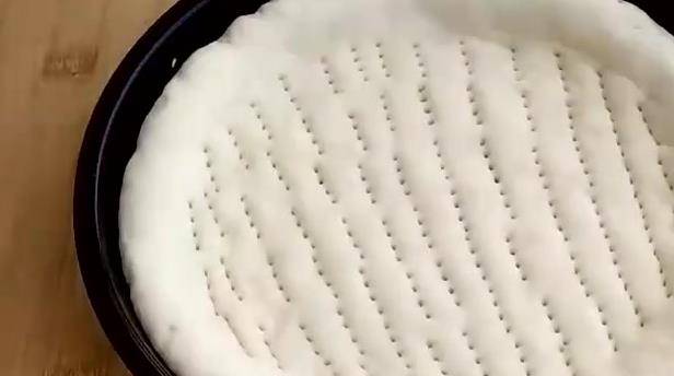 面醒發好瞭,揉搓排氣,面團中間切開,揉圓。模具底部刷油,放入面團用手均勻推開,邊緣高一些。面餅底部用叉子叉些小孔,蓋上保鮮膜二次醒發15分鐘。餅皮上刷油,再刷一層披薩醬,撒上芝士碎,再撒上準備好的配料。