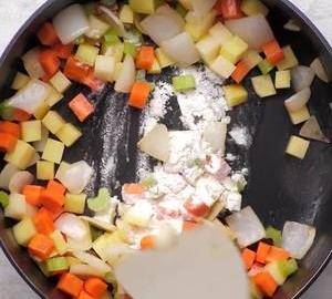 番茄(中等大小)2個土豆(中等大小)1個胡蘿卜1/2個洋蔥(中等大小)1/4個芹菜50g圓白菜(中等大小)1/4個肥牛片200g面粉20g鹽4g黑胡椒0.5g油(炒蔬菜)15ml油(炒面粉)5ml清水1500ml糖3g