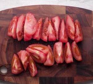 放入香葉、番茄塊,倒入清水水燒開後煮30分鐘。