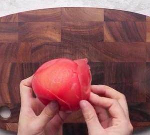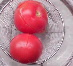 番茄用水果刀輕輕劃一個十字,倒入沒過番茄的開水,燙1分鐘。
