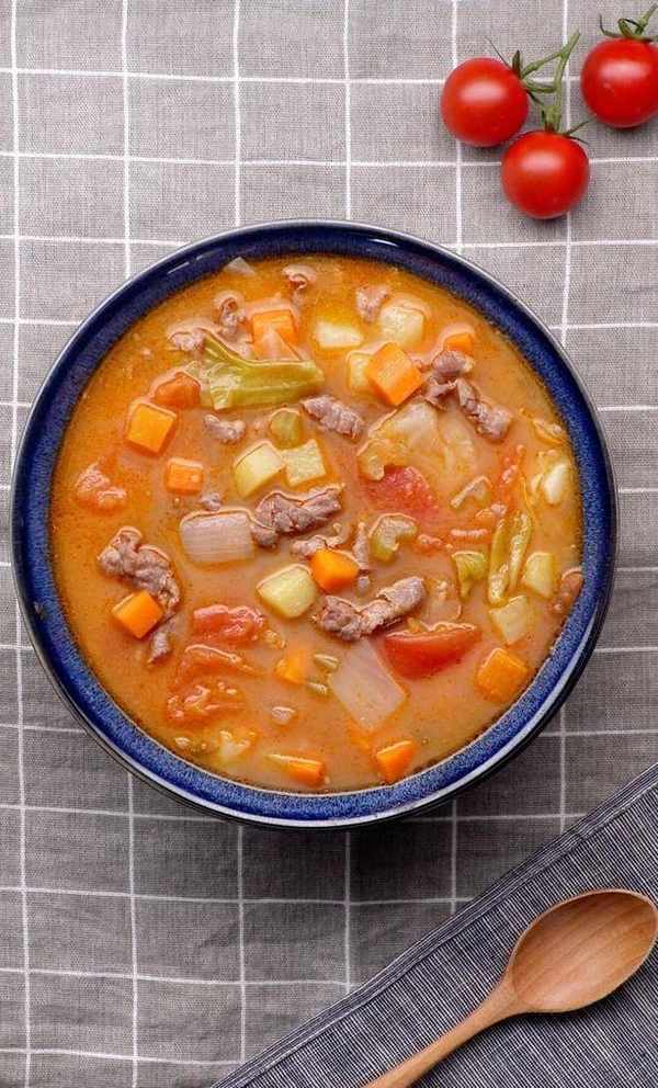 這是一個簡化版的羅宋湯,傳統做法是先燉煮牛腩肉至軟爛,再炒蔬菜,倒入牛肉和牛肉湯同煮,但是因為燉煮牛肉時間比較久和麻煩,所以直接選用瞭快熟的肥牛片,既縮短瞭時間又保證瞭味道。