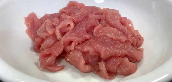 準備一塊裡脊肉,把上面筋膜片處理幹凈,先用刀從中間片開,切成薄片,全部切好後裝入碗中。