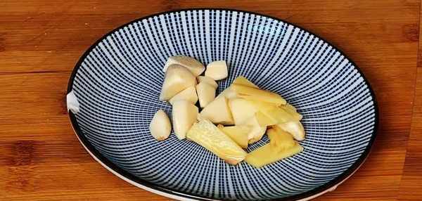生薑一塊切成薑片,大蒜切成蒜片,切好後放入碗中。