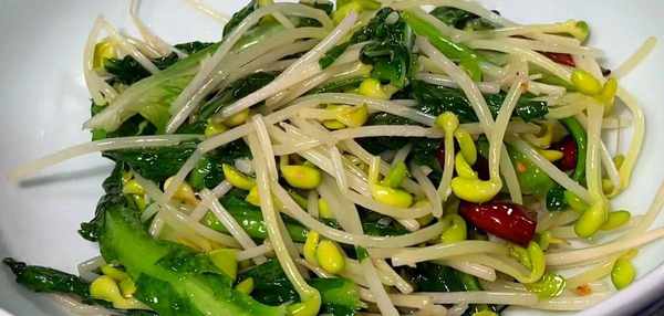 準備配菜,一些洗凈黃豆芽和青菜備用。