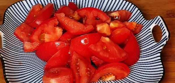 西紅柿底部摘掉,把西紅柿對半切開,把中間白色硬心去掉,再把西紅柿改刀切成滾刀狀,切成小塊,切好後裝碗中備用。