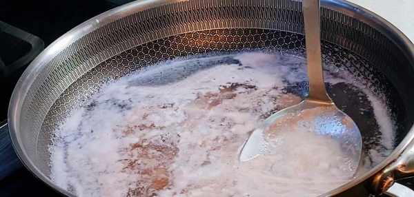 把火轉成小火,把醃制好的肉片下入鍋中,肉片下鍋要分散下,防止粘連在一起,肉片全部下鍋後,先不要著急去攪動,開小火把肉片煮熟,用勺子輕輕推動一下,開大火把肉片煮一分鐘,煮到肉片都漂浮起來,就已經熟瞭。