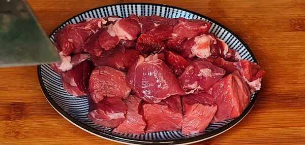 牛肉洗凈改刀切成長條,再切成小丁,切好以後放入碗中備用。