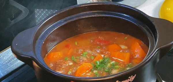 時間到,再加少許食鹽,再把蔥花加進來,用勺子翻動一下,翻拌幾下,就可以出鍋裝盤瞭,美味的西紅柿牛肉湯就做好瞭,做法非常簡單。