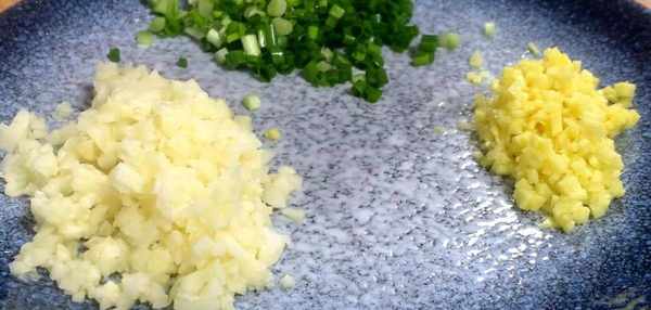 大蒜拍一下,剁成蒜末,生薑切成薄片,再切成薑末,小蔥切成蔥花,切好裝入盤中。