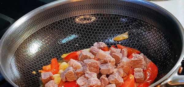 鍋燒熱,加入多一點食用油,把薑蒜加進來,快速翻炒一下,把西紅柿加進來,快速翻炒均勻,把西紅柿汁水炒出來,再把牛肉丁加進來,快速翻炒均勻,翻炒三分鐘,加點生抽,老抽,蠔油,快速翻炒均勻,把牛肉丁炒至入味,翻炒一分鐘,再加入開水,蓋上蓋子,大火燉上十分鐘,湯汁煮出滋味,西紅柿也部煮軟。