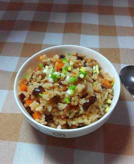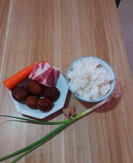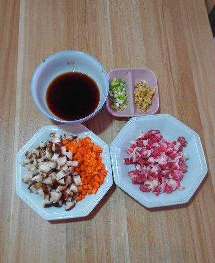 把香菇和胡蘿卜洗凈後切小丁;豬肉也切小丁;薑切末;小蔥切蔥花;另取一小碗,老抽,料酒,生抽按1:1:2的比例調入,再加少許白糖及少量清水(用幹香菇的親,把泡香菇的水倒一部分進去)。