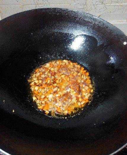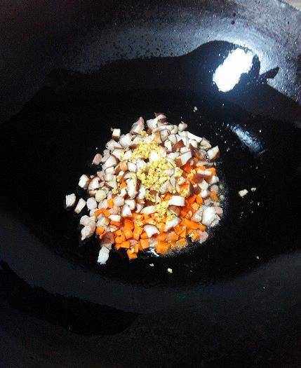 下香菇丁,胡蘿卜丁,薑末,翻炒大約1分鐘。要用蝦皮的親,也現在一起下。