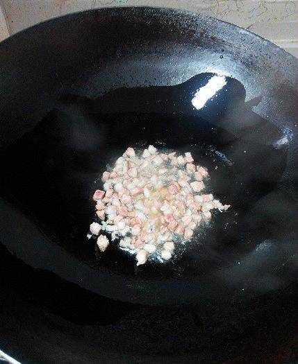 鍋裡熱油,下肉丁炒至變色。用五花肉的話,就煸炒至出油。