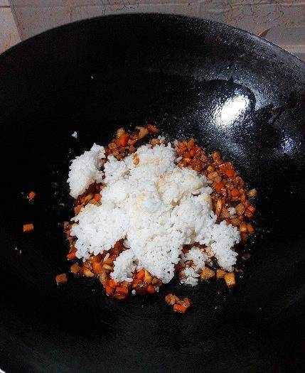 煮至還剩少許湯汁的時候,倒入剩飯,翻炒均勻,最好能粒粒分明,待剩飯炒熱瞭即可關火。不用再單獨放鹽和雞精。當然,如果你實在覺得淡或還不夠鮮,可以適當加點兒~