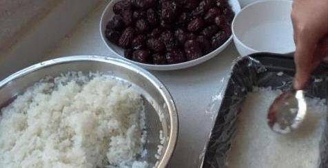 4、用湯匙反復按蒸好的糯米,然後取下便當盒,在最裡面鋪上保鮮膜,然後鋪上糯米,用湯匙凝固,上面鋪上棗子,然後在棗子上鋪上糯米這樣把3層糯米鋪成兩層反復做棗。