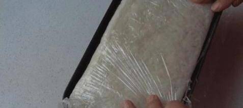 5、最後用保鮮膜包好,雙手將糯米壓平,放入冰箱冷藏約1小時。