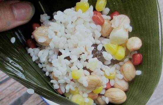 6.然後就把所有的食材給混合在一起,放到粽葉裡面,再把蜜棗給放上去一個。之前吃的還有放兩個的蜜棗,兩個也是可以放得啦。