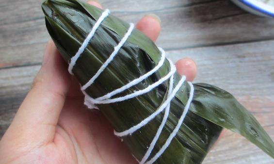 8.把粽子給包好,然後用大拇指個按住,用繩子給捆起來。