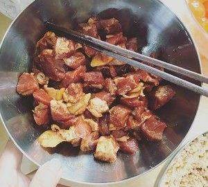 梅花肉切小塊,我直接喊賣肉的老板切的,這種帶肥帶瘦的前腿肉包起來超好吃。洗凈瀝幹水,生抽,老抽,白糖,白酒,白胡椒粉,生薑片醃上,塑料袋包裹放置冰箱四小時以上,過夜為佳。