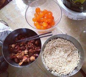 圓糯米泡半個小時瀝幹水,加入生抽,老抽,白胡椒粉,料酒調味,可以稍咸一點,因為下水以後味道會被稀釋,梅花肉拿出來,咸蛋黃準備好,要開始包啦
