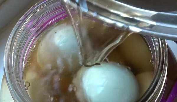 3.準備個幹凈的玻璃瓶,把準備好的咸鴨蛋慢慢地放進去。放涼的精鹽水也倒進來,在上面封上一層保鮮膜。密封保存三天就可以吃啦。