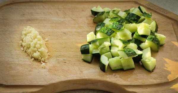 1.首先準備新鮮的黃瓜兩根洗凈,然後放在案板上用搟面杖給它用力地拍散。用刀切成小塊,放入碗中備用。大蒜一頭砸成蒜泥。