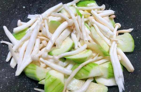 第五步:把絲瓜放入翻炒一下,再加入海鮮菇一起翻炒。