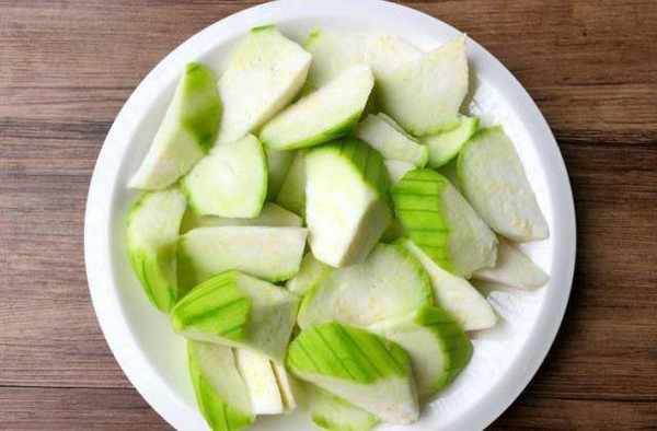 第二步:絲瓜切掉頭尾,刮掉外皮,再切成滾刀塊,放入盤裡待用。