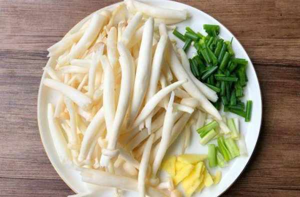 第三步:海鮮菇剪掉根部,清洗幹凈再切成兩段,蔥洗凈切段,生薑去皮洗凈切片。