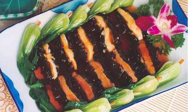 3、炒鍋內加入清湯、紹酒、蔥薑水、精鹽、味精燒開,去凈浮沫,用濕淀粉勾溜芡,加雞油淋在海參上即成。