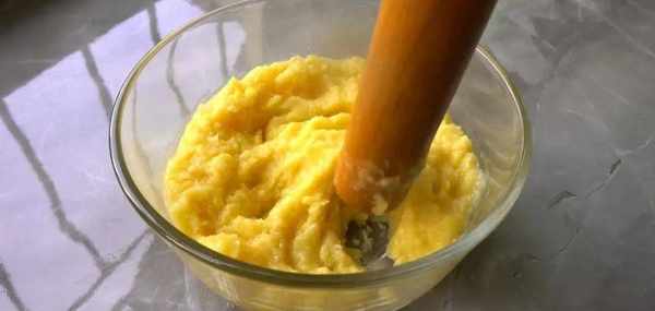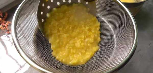 撈出來濾掉多餘的水份,用搟面杖搗幾下,大致搗成綠豆泥。