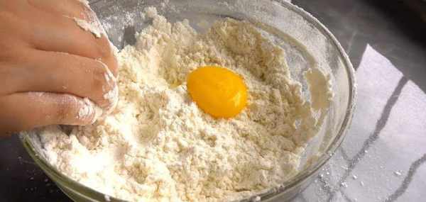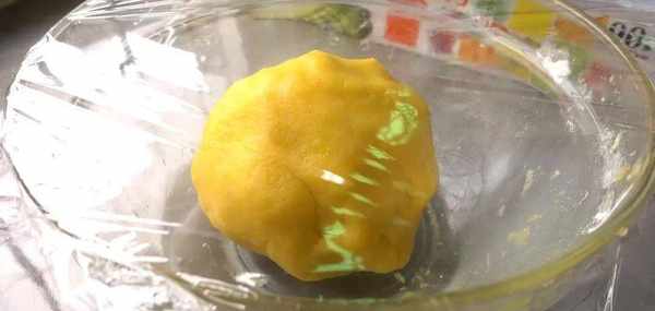 然後一個接一個地加入蛋黃,混合成面團,蓋上保鮮膜醒面。